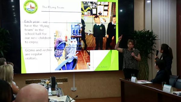來(lái)訪的嘉賓有英國(guó)德比市索利中學副校長伯頓·艾麗森,多夫多拉小學校長豪斯曼·莎拉,副校長戴維斯·馬特,夏德洛小學校長泰伯·凱莉,穆雷公園學校副校長索姆斯·麗貝卡,巴克斯頓的聖托馬斯莫爾天主教學校副校長希基·布蘭登,威羅信托總裁哈依·珍妮。合肥市教育局總督學吳慶防,合肥市教育局專員(yuán)張媛,廬陽區教體(tǐ)局副局長婁平以及南門(mén)小學校長費廣海等校領導接待來(lái)訪。