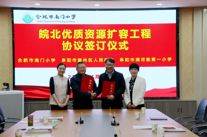 在兩地教育主管部門(mén)的共同見(jiàn)證下,合肥市南門(mén)小學與颍州區清河路(lù)第一小學,合肥市四十五中學與颍州區京九中心校分(fēn)别簽訂結對幫扶協議(yì)。